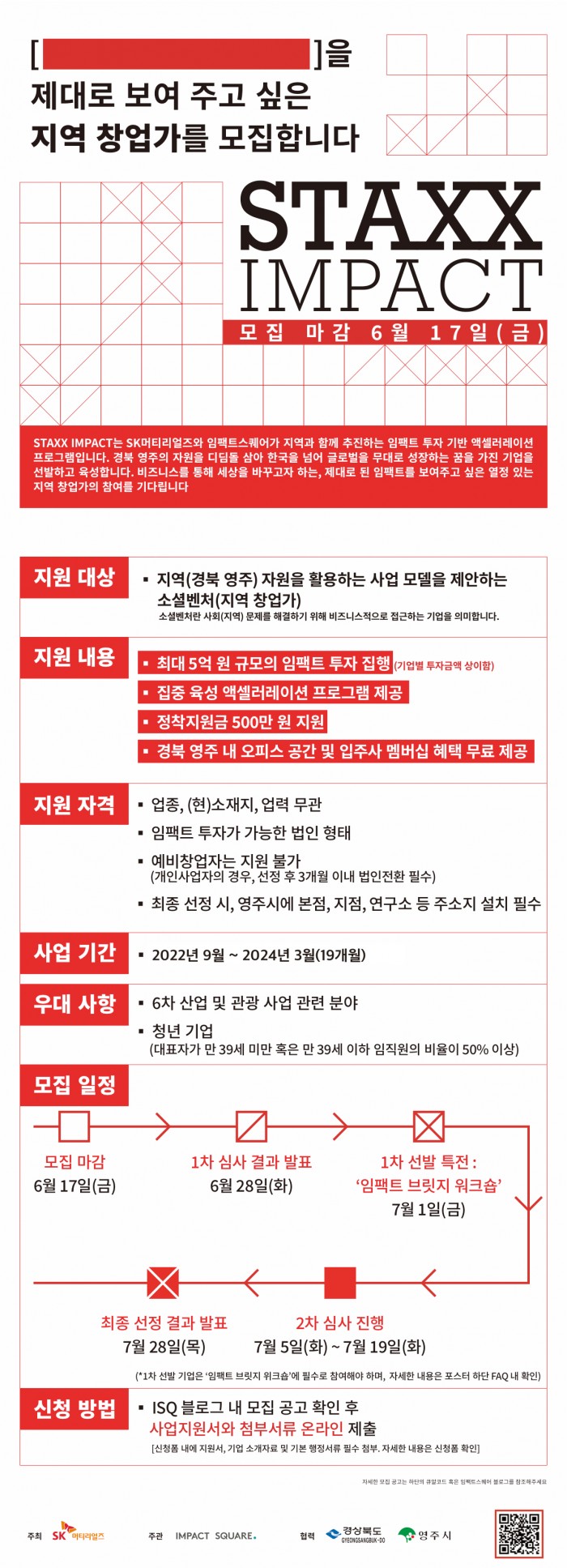 STAXX IMPACT는 경북 영주의 자원을 발판으로 제대로된 임팩트를 만들어갈 소셜벤처(지역창업가)를 지원하는 사업입니다.